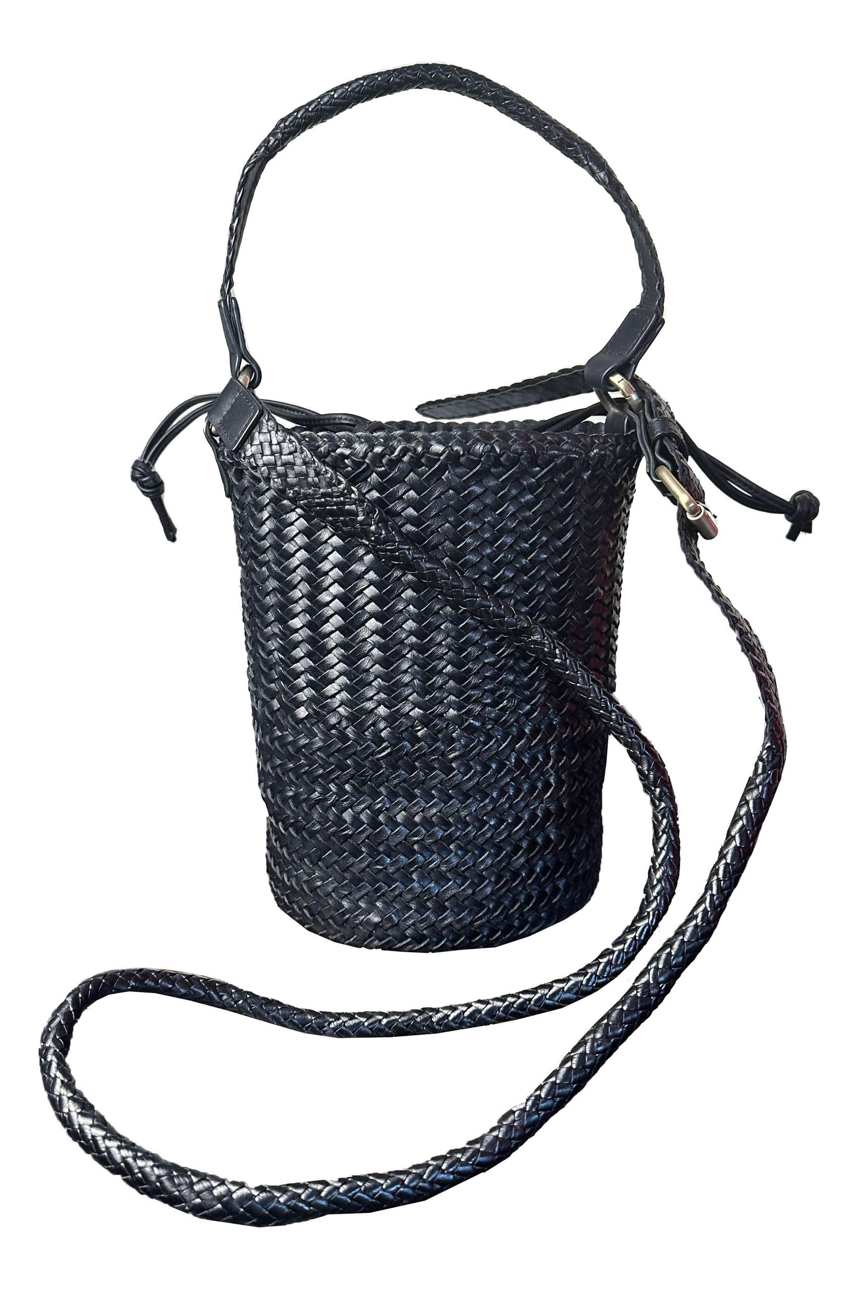The Allan K Pomelo DJ Toledo Leather Woven Bucket Bag, crafted with 100% buffalo light leather, offers two carrying options: a compact short handle and an adjustable, detachable shoulder strap.