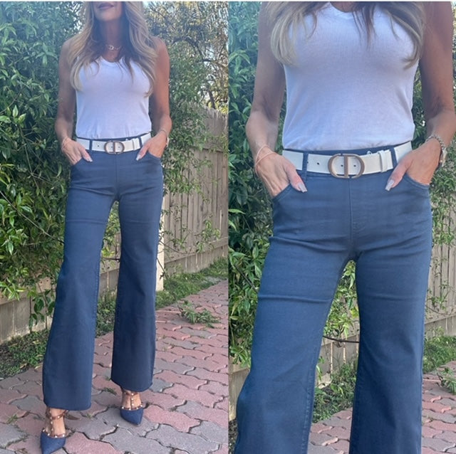 Bevy Flog Amanda one of fastest selling styles. Amanda Wide Leg Pants are a great addition to your wardrobe. Amanda is a flattering easy fitting bottom, which can be worn casual or dressy. Very comfortable with great stretch, can be worn with belt or without. You will love the look and feel.