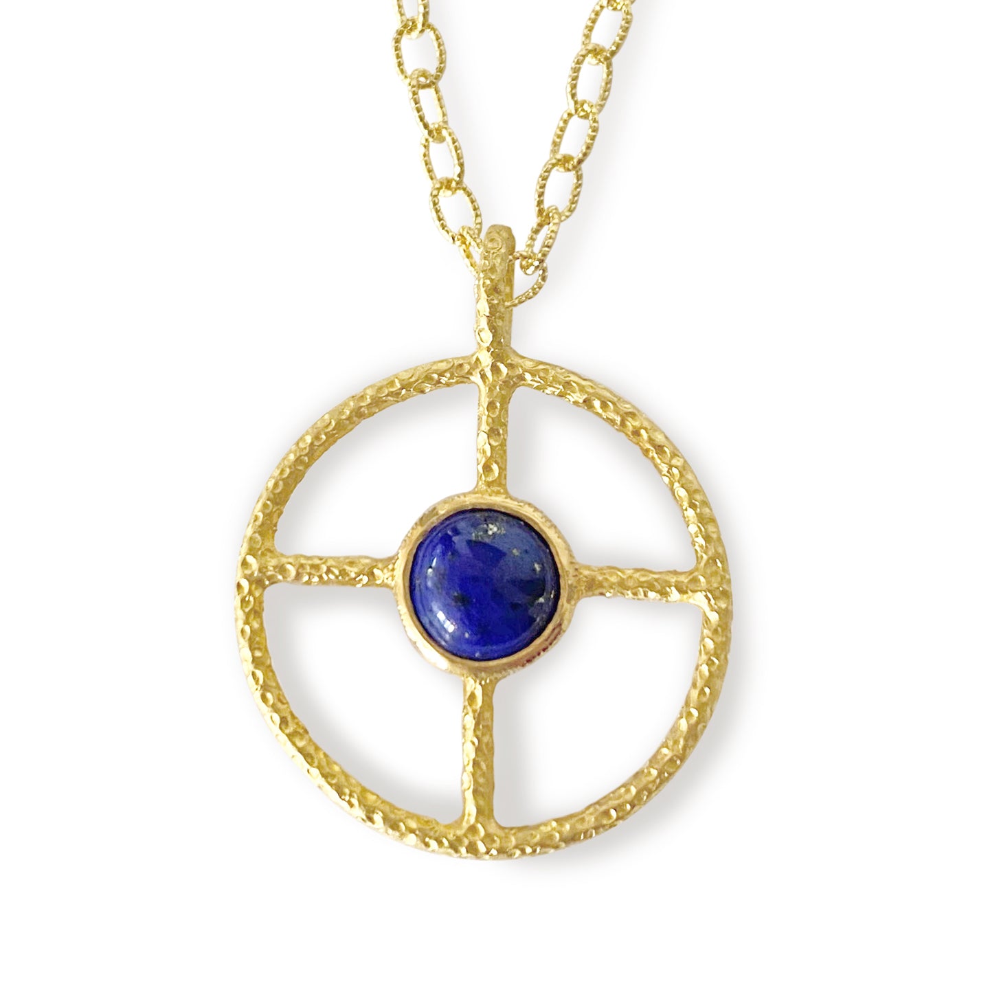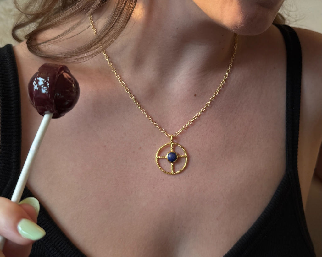 The SUNLIT Fine Jewelry Gold Lapis Sun Cross Medallion is a striking pendant necklace featuring a hand-fired textured design and a vibrant lapis lazuli stone. The sun cross motif, originally embraced by prehistoric and Bronze Age cultures, symbolizes life’s cycles, the unity of all existence, and the sun as a vital life source. Lapis lazuli, cherished for its deep hue since ancient times, was a favorite in Egyptian amulets and iconic ornaments like King Tut’s mask. Its natural pyrite flecks add a touch of golden brilliance, making each piece uniquely captivating.