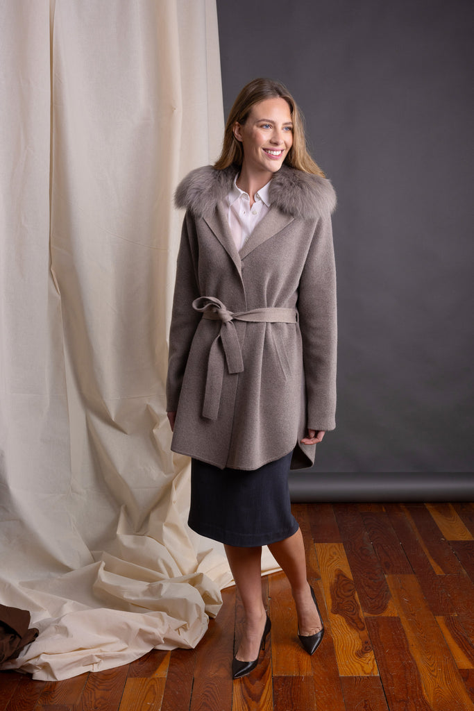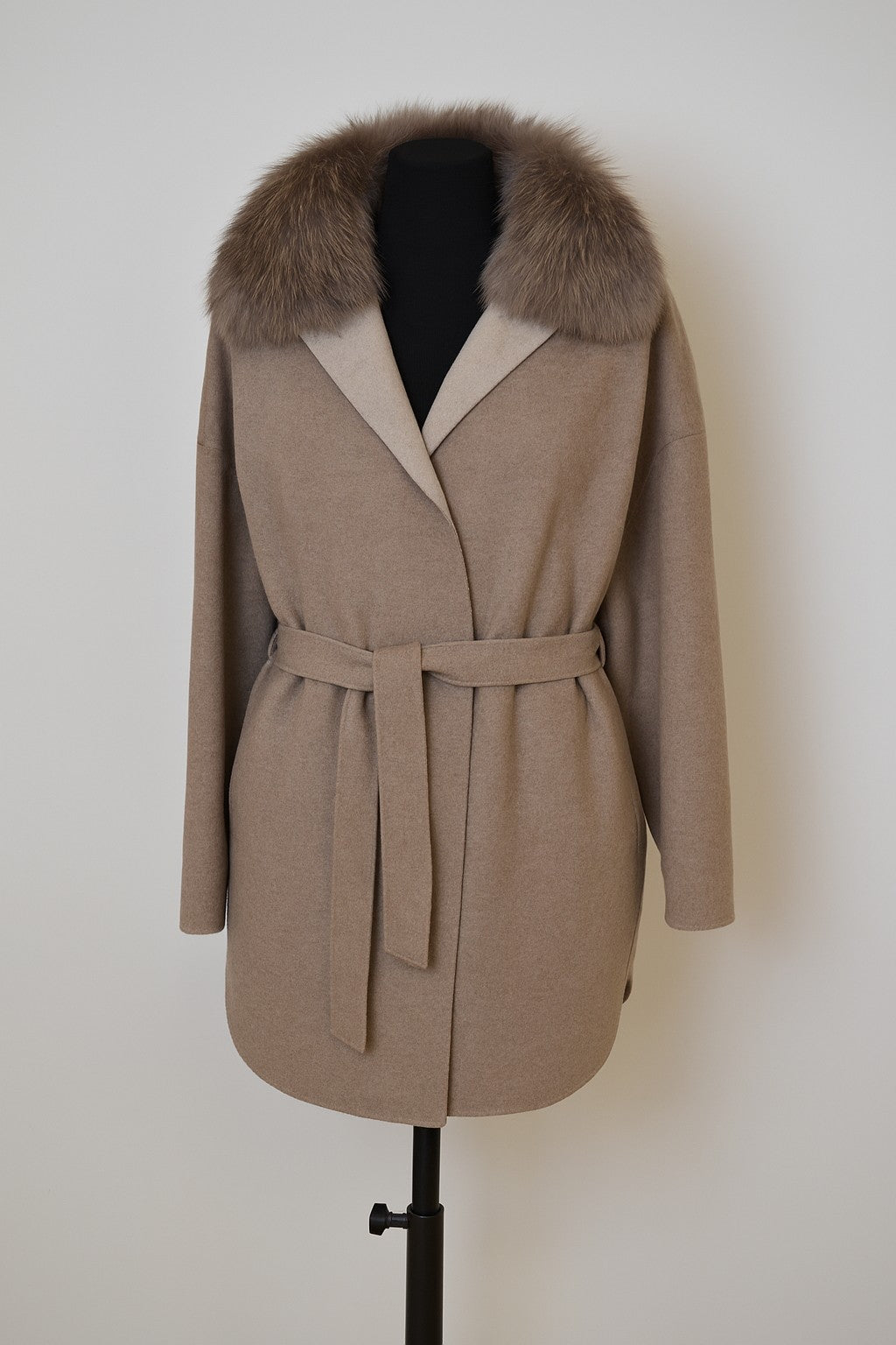 Elevate your outerwear with the SUPREMA Women's Knit Jacket, style 25AMY502-T0166-123x101, in a refined Sand Milk colorway. This luxurious jacket features a detachable genuine fur collar for versatile styling, and a sash with two-sided contrast in milk and sand for added elegance. Designed with snap closure and front pockets, it blends functionality with timeless sophistication. Crafted from a premium blend of 40% wool, 30% viscose, 20% polyamide, and 10% cashmere, this knit jacket offers warmth, softness, and durability—perfect for transitional seasons.