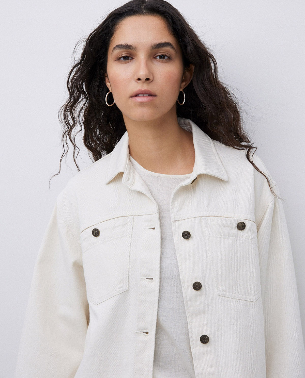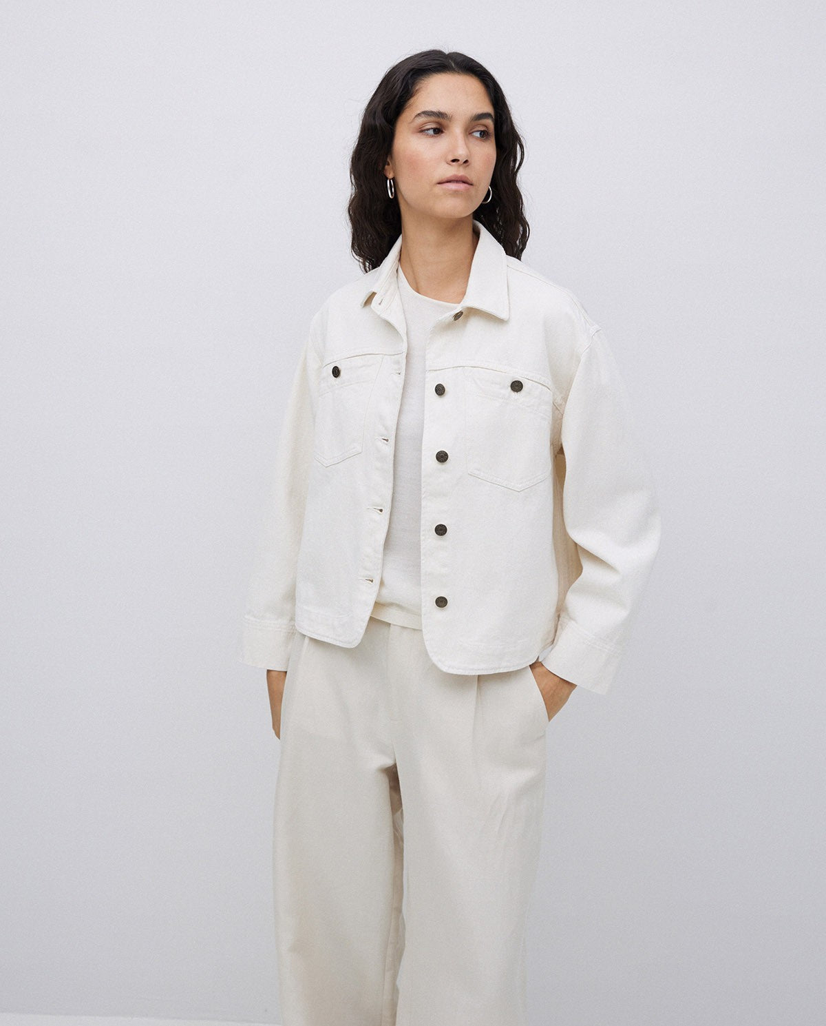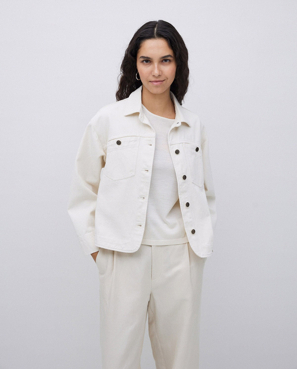 Introducing the Yerse Laguna42 Organic Cotton Jacket 42862 in Ecru. Crafted with 100% organic cotton with Oeko-Tex dye, this chic and classic denim jacket is perfect for layering. Stay stylish and functional with its convenient pockets. Upgrade your wardrobe with this sustainable and versatile piece.
