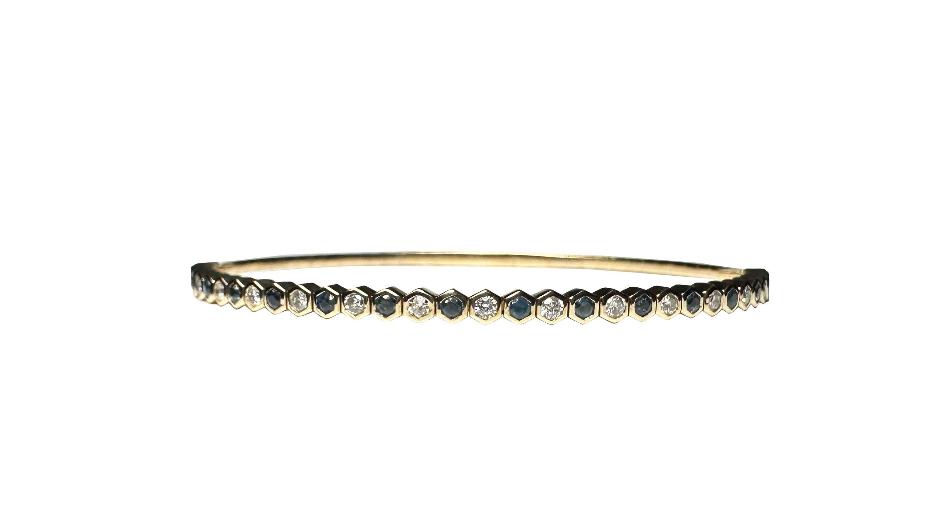 Transform your style with this stunning FC Creations Bracelet. Made with 14K yellow gold and adorned with sparkling diamonds and sapphires, this elegant bangle adds a touch of luxury to any ensemble. With a total carat weight of 0.52 for the diamonds and 0.70 for the sapphires, you'll shine bright and feel confident wherever you go!
