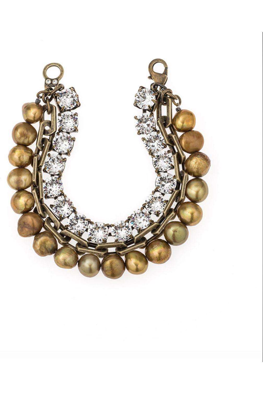 Love French Kande? We do! French Kande Triple Strand Baroque Pearl Honfleur Chain And Austrian Crystal CT743-X is an all day everyday piece. This bracelet features three strands of gold Baroque Freshwater Pearl, Honfleur chain and Austrian Crystal. Absolutely beautiful all by itself or layered with our other designs.