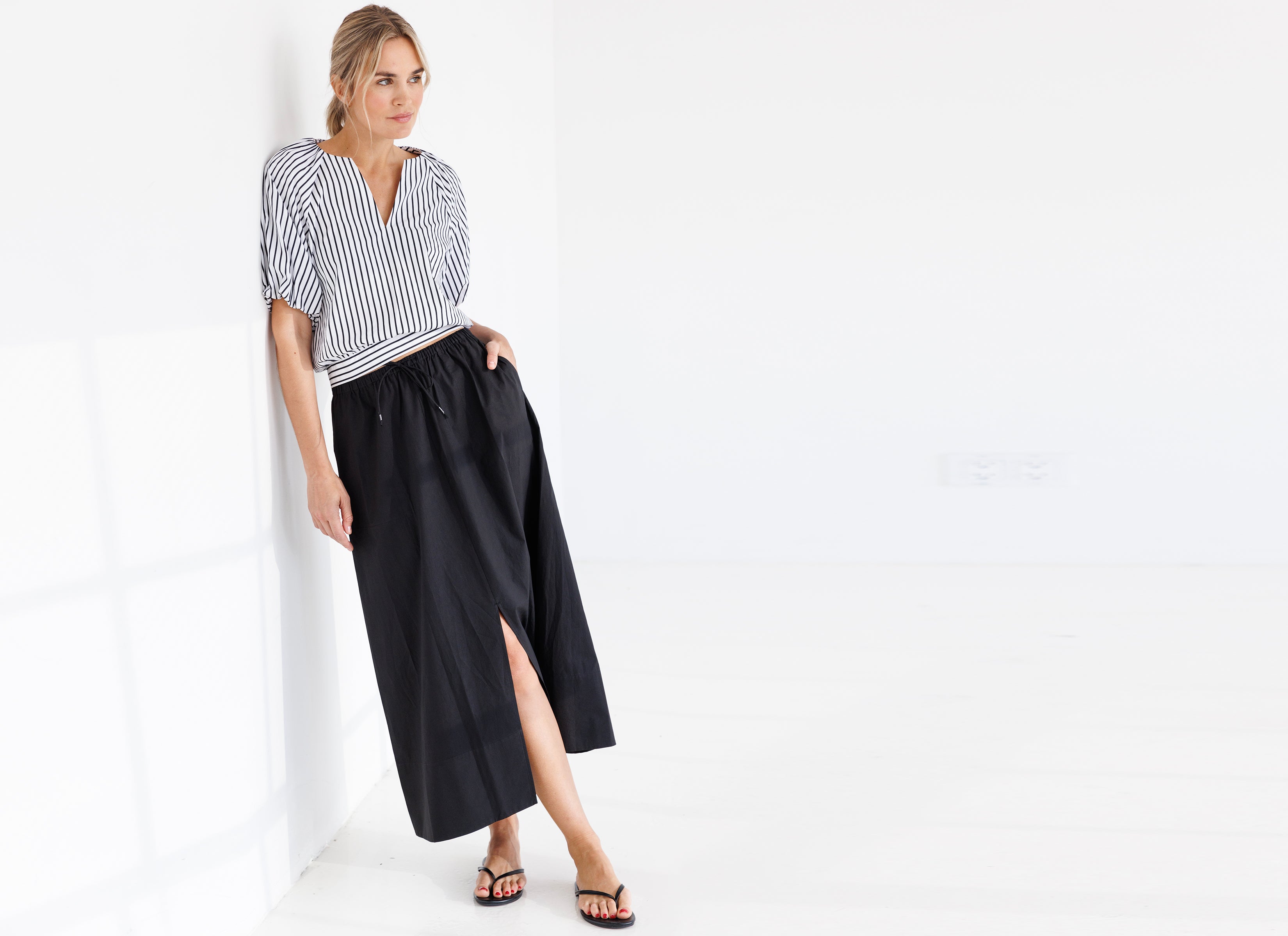 Make a statement with the Go by Go Silk Go Full Swing Skirt. This must-have piece features a drawstring waist, side pockets, and split front opening for ultimate style. Perfect for the fashion-forward individual.