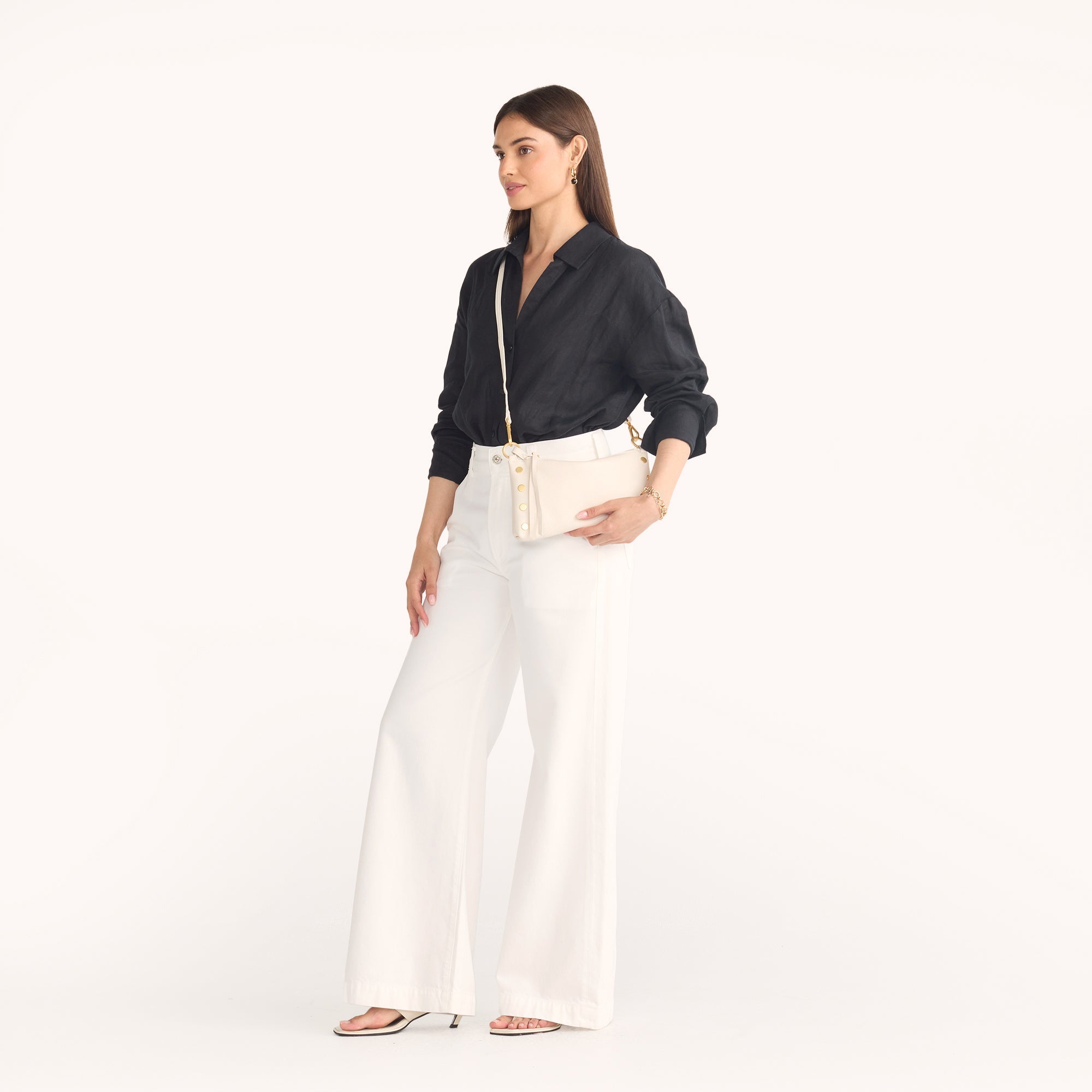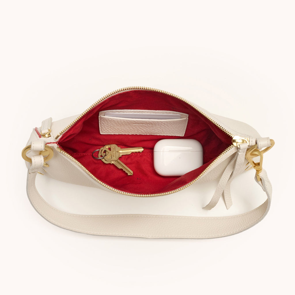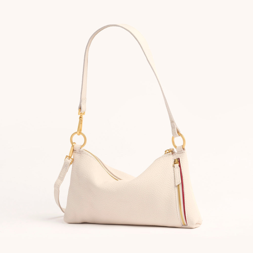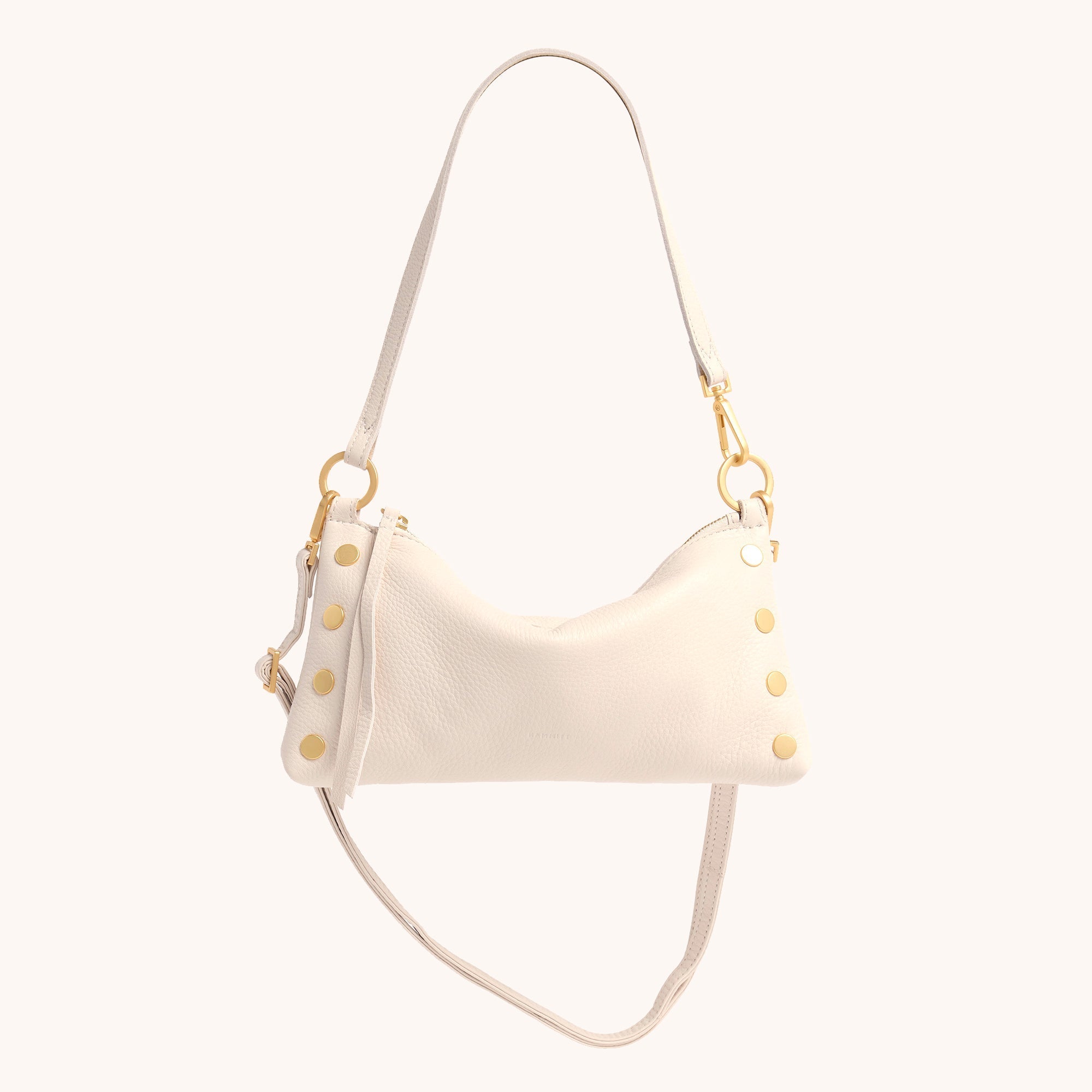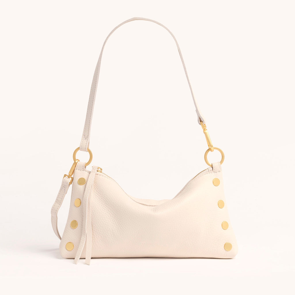 The Hammitt Kyle Shoulder Bag is a must-have companion for nights on the town. Featuring a slouchy but current shape, with luminous warm white pebbled leather and accented with brushed gold hardware, this bag exudes edgy elegance. It transitions from a wristlet to a shoulder bag in seconds flat. The Kyle also includes a removable and adjustable crossbody strap, so you can go hands-free and allows the Kyle to be worn 3 different ways depending on your look!