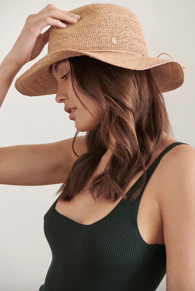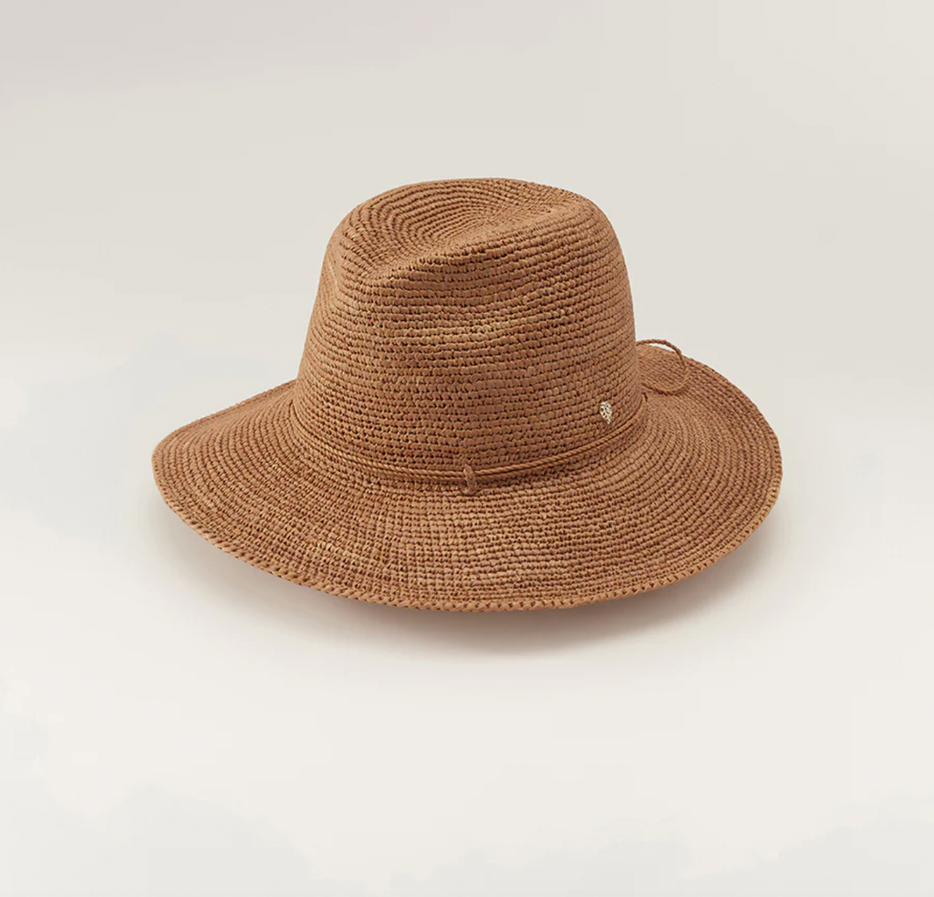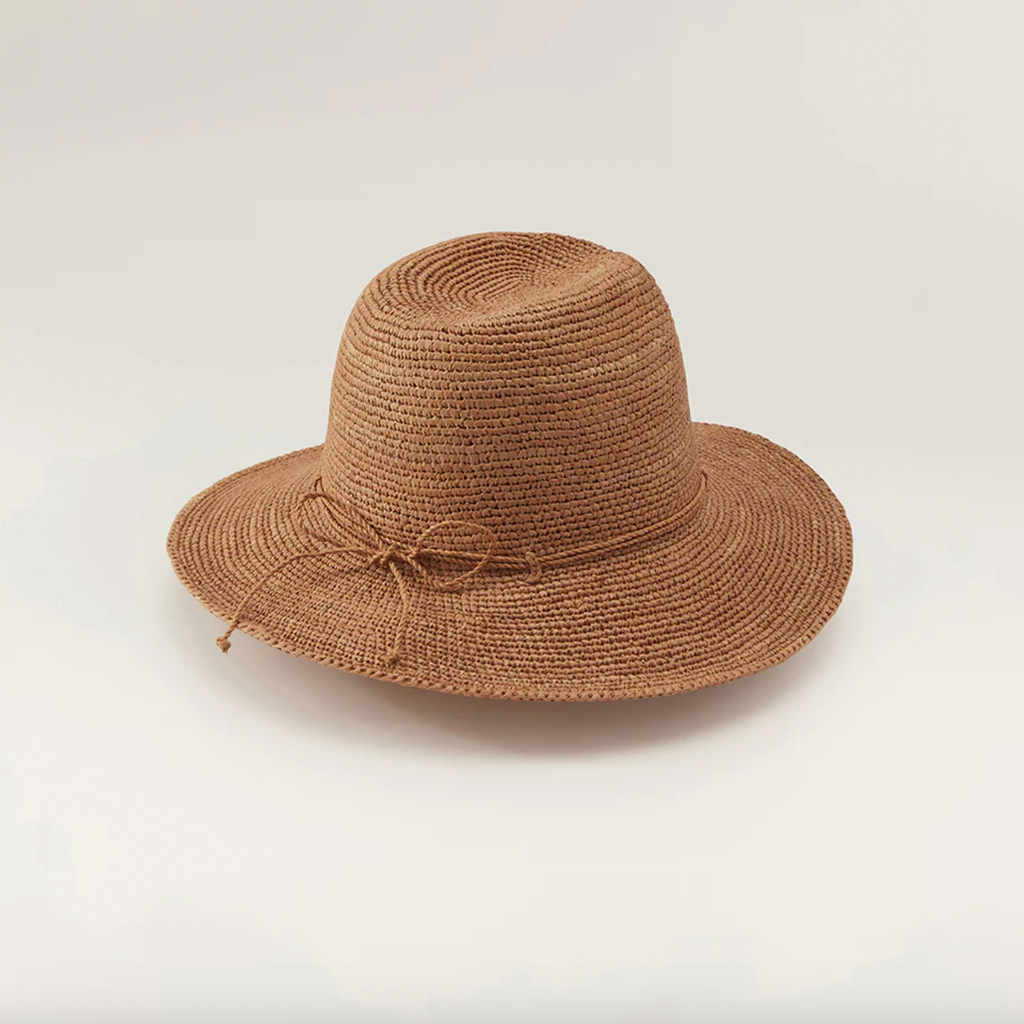 A Helen Kaminski hallmark Fedora silhouette. Desmonda offers timeless grace and style with the added natural form; 100% Madagascan hand crocheted raffia. Featuring a tall fedora crown and 8 cm brim, this style is finished with a size adjustable raffia tie and rolls nicely to pack and travela 8 cm brim. This style will easily be your summer go-to accessory.