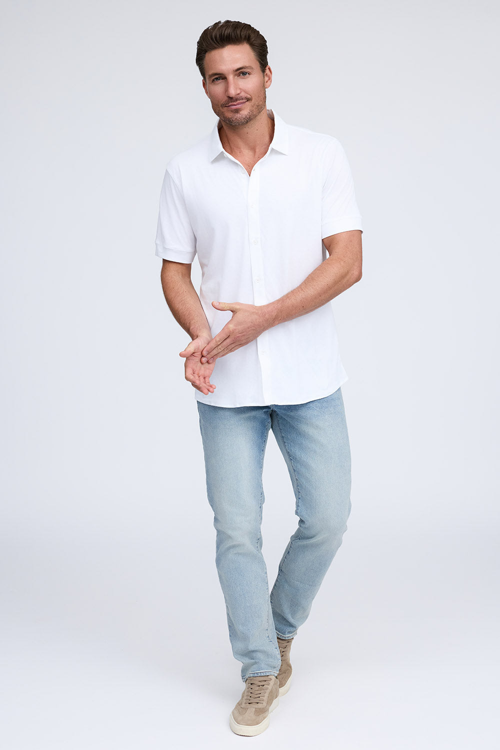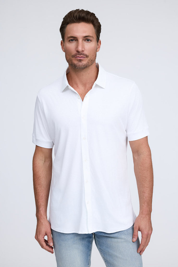 Raffi Aqua Collection The Linden is a perfectly fitted short sleeve button down. The Linden is a great option to take you from work to a night out.