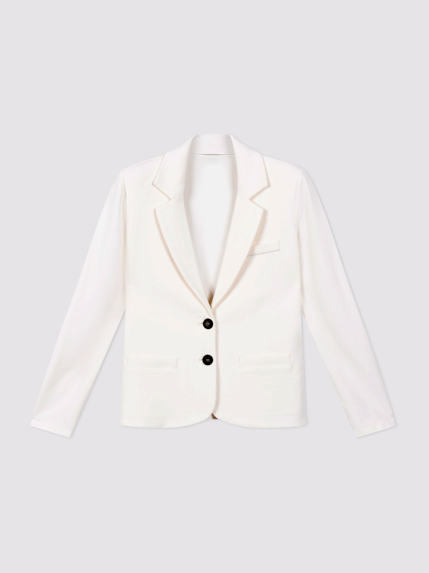 REPEAT Cashmere Tailored French Terry Sweatshirt Blazer 500044 in Ivory blends the ease of loungewear with the refinement of tailoring. Crafted from a soft modal–cotton French terry, this lightly structured blazer features a smooth hand feel, subtle stretch, and a loopback interior for elevated comfort.