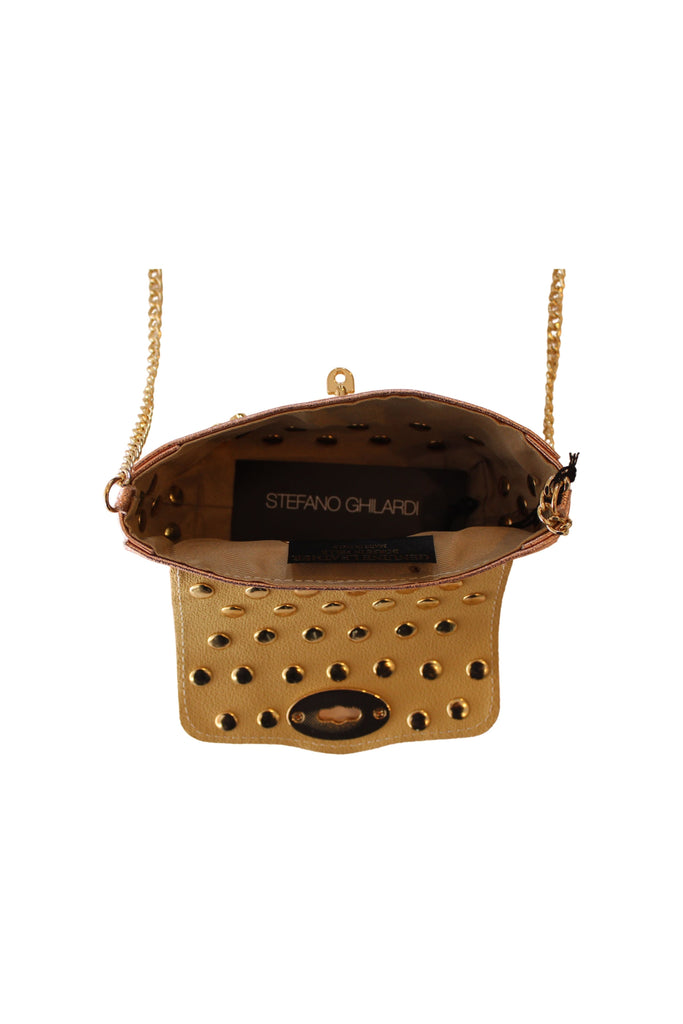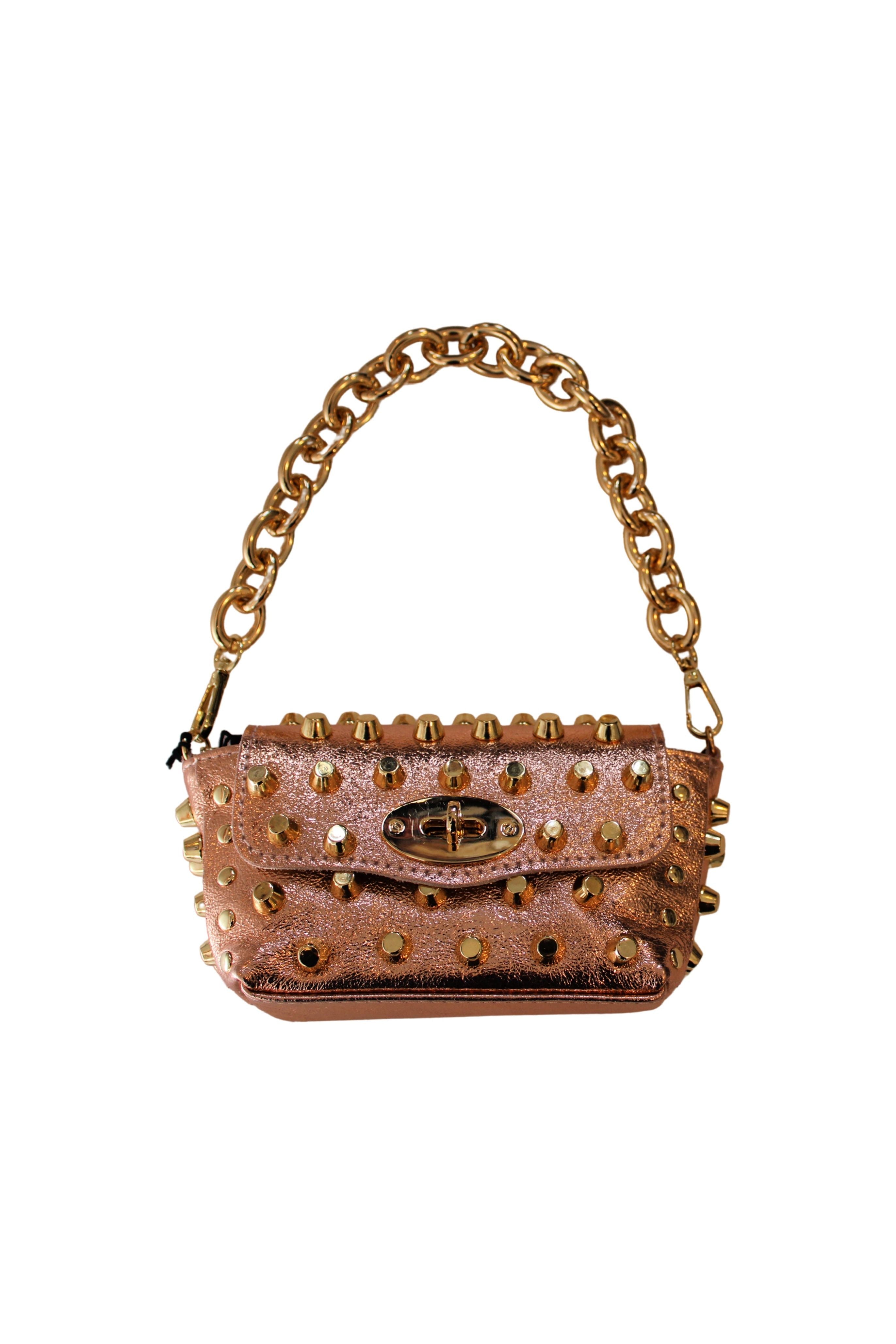 Stefano Ghilardi Martha 111 Studded Leather Crossbody Bag is the perfect little bag. It is all about the details. This mini bag is composed of soft leather, embellished with outstanding gold hardware and two chains. One removable chunky shoulder strap and delicate crossbody link chain.