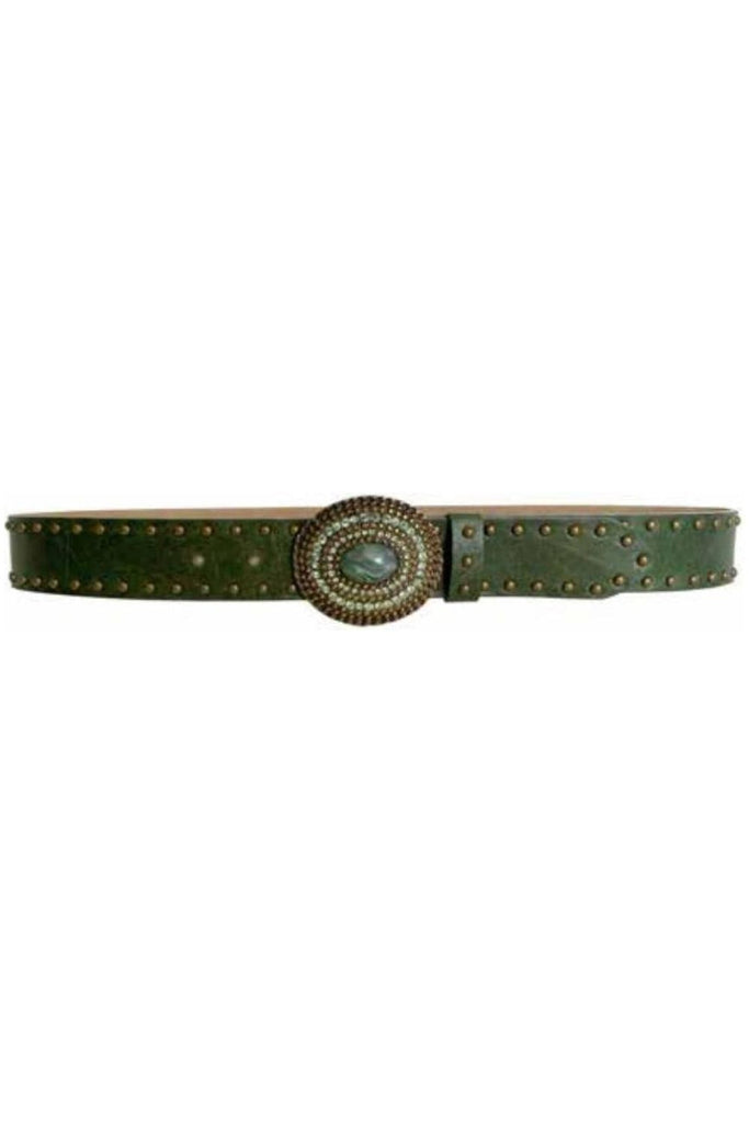 Streets Ahead 1.5 inch Embellished Leather Belt 42170 | Olive Leather/Brass Buckle Crystals and Turquoise