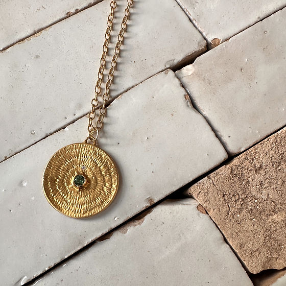 Get ready to be captivated by the breathtaking SUNLIT Fine Jewelry SUNBURST Pendant. Adorned with vibrant green tourmaline and sparkling white diamond, this pendant exudes elegance and luxury. The intricate hand-fired texture adds depth and character to this statement piece. Don't miss your chance to own this stunning pendant, featuring both green tourmaline and diamond. Part of SUNLIIT's signature Goddess Collection of jewels that celebrate sun goddess energy with intentional textures and elemental shapes hand-wrought in luminous 22-karat gold.